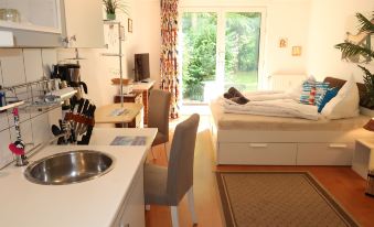 Resort "Tossens". 1 km from the centre of Tossens, on the outskirts, 13 km from the centre of Burhave, 24 km from the centre of Nordenham, 700 m from the sea, in the countryside. In the house: bistro, playroom, central heating system, bicycle rental. Parking at the house. Supermarket 1 km, bus stop 150 m, grass beach 700 m, indoor swimming pool 500 m. Please note: suitable for families. The photograph shows a typical example. All houses/apartments are individually designed/furnished. Guests receive a 50% discount on entry to the Aqua Mundo indoor swimming pool. All other facilities within the park can be used (some for a fee). 1-room apartment 25 m2, on the ground floor. Cosy furnishings: living/sleeping room with 1 double bed, dining table and satellite TV (flat screen). Exit to the terrace. Open kitchen (2 ceramic glass hob hotplates, toaster, kettle, microwave, electric coffee machine). Shower/WC. Gas heating. Lawn. Terrace furniture. Please note: non-smokers only. Maximum 1 pet/ dog allowed. Smoke alarm, fire extinguisher.