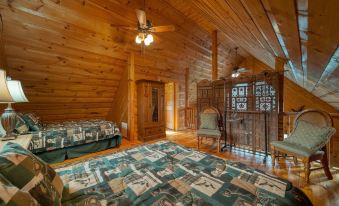 This creekside cabin is right on the water. It has a sister cabin next door that is also a 3/2. This one has has 2 queen size beds in the loft and 2 queen bedrooms on the main floor. Enjoy the fire pit next to the water while sitting under the stars. There is no cell service at this cabin. The laundry is located between the cabins.