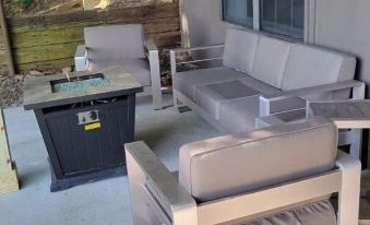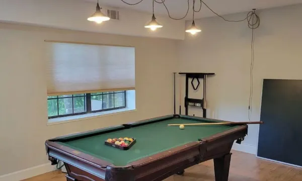 The cabin is close to Lake Chatuge. The basement is great for entertaining. The large one room basement has the pool table, bar area, and a seating area around the electric fireplace and 70 inch TV. There are also several outdoor seating areas to relax and take in the views.