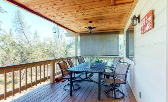 Plan your next stay at this spacious, family-friendly home in Groveland, one of this area's historic Gold Rush towns! Inside this well-appointed, two-story home, you'll find a well-equipped, gourmet kitchen that is sure to please the visiting chefs in your party. Dine side-by-side at the kitchen counters, or enjoy formal meals together at the nearby table for eight. The dining area is part of an open great room with peaked, exposed beam ceilings, and a warm and inviting living area with a large sectional sofa, flatscreen TV, and a wood stove. Outside, this home features a furnished balcony, deck, and front porch where you can dine al fresco or just enjoy the fresh air. And when it's time to turn in for the night, this home offers four cozy bedrooms including a master bedroom with a king-size bed, one guest room with a queen, a third room with a double, and a kid-friendly room with twin-over-full bunk beds.