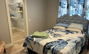 A wall of windows creates the atmosphere you need after a few hours working from home upstairs if needed. Our property features 3 queen beds, 2 twin beds, and 2 bunk beds (twin on top of a double below), perfect for a group getaway. Bedroom 1 and 2 are on the first floor. Bedroom 3 and 4 are upstairs with the desk nook and the third full bathroom that does have a tub if needed.