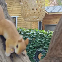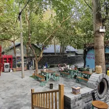 시설: 작은 마당이 있으며, 시원함을 유지하기 위해 테이블이 나무 그늘 아래에 놓여 있습니다.