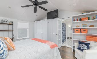 Little Pearl is certainly a gem because of its in-ground swimming pool heated to 80 degrees from April 1st through November 1st. Surrounded by several wispy trees, the pool offers sunlight basking and a few dappled, shady areas. Of course, Tybee Island vacation homes include many chairs, loungers and tables around the pool for a relaxing time. Against the home, an outdoor shower is cleverly hidden away behind wood paneling. It's easy to slip out of the pool, into the shower and back inside on those warm days.