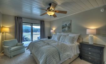 Bedroom 1: king bed, dresser, two closets, sliding doors to porch with lake view. Master bathroom with new shower and single sink vanity