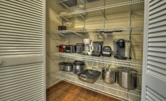 kitchen: full kitchen stocked with microwave, fridge, dishwasher, oven and coffee pot. Pantry has full pots and pans, dishes, cooking utensiles, blender, sandwich press, wine glasses and bar ware.