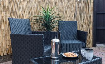Outside, a private paved garden with seating is perfect for relaxing.