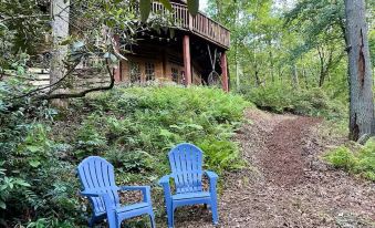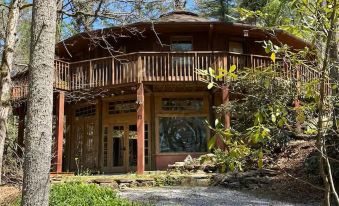 The Roundhouse is in the trees overlooking Finley Creek. It is a 2 bedroom, 2 bath roundhouse with a great room (living room and kitchen), skylights, granite counters, whirlpool tub, nice deck with grill and propane fire pit, super clean, high quality bedding and kitchen appliances and accessories, added amenities, everything you need. Robes provided for your privacy as the shower is in secondary bathroom. Private and secluded but only 2 miles from Downtown Hendersonville.