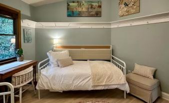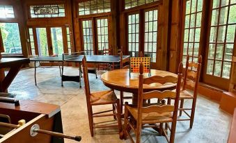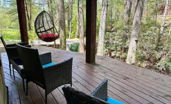 The downstairs is all windows and French doors and is accessible from an outdoor staircase. We have turned it into a game room with a pool table, ping pong table, darts, a game table with board games, foosball table, Wifi and a blue tooth speaker. It opens up to a deck with a hanging nest chair and comfortable porch furniture that over looks a path down to Finley Creek. We have Adirondack chairs down at the bottom that you can sit in and be by the creek or move onto the creek and soak your feet. We also have a large bucket of creek toys and Turkish towels for kids to play and pan for gold.