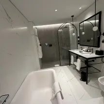 천장이 높은 객실과 깔끔한 욕실로 편안함을 느꼈습니다