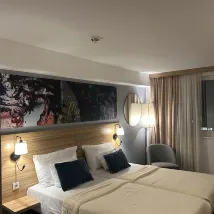 지하철역이 바로 옆에 있어서 이동이 매우 편리합니다. 모퉁이 바로 앞에 큰 슈퍼마켓이 있어요. 아침 식사는 매우 좋았고 선택의 폭이 넓었습니다. 불만족스러웠던 점은 위생이었습니다. 화장실에서 냄새가 나서 밤에는 문을 닫아야 했습니다. 청소 직원들이 방을 제대로 청소하지 않았습니다. 밤에 호텔로 돌아와 보니 방 안의 의자는 그냥 널려 있었고, 사용한 찻잔은 교체되거나 씻겨지지 않았습니다. 화장실도 청소되지 않았습니다. 침대만 정리되어 있었고, 그 외에는 아무것도 청소되지 않았습니다.