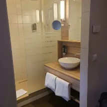 숙소 답변: Dear Guest,Thank you for taking the time to share your feedback!We're pleased to hear that you found our recently remodeled accommodations to your liking. At Leonardo Hotel Vienna Hauptbahnhof, we strive to provide a clean, pleasant and comfortable environment for all our guests.We acknowledge your remarks about the location and the shower booth. We believe that our location, albeit a bit away from the city center, offers a unique charm and a quieter, more relaxed atmosphere.We appreciate your feedback about our food services. We aim to provide something pleasing for everyone, even during peak hours when it can get a bit busy.Please remember, during your next stay, our staff members are always on hand to assist with any queries or concerns you may have regarding amenities or toiletries.Thank you for your valuable feedback. We look forward to welcoming you back soon.Best regards,Milica KrojsGuest Relation Agent