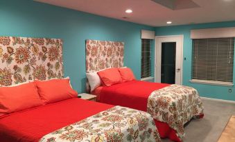 We loved this house! We had a group of 10 ladies that were attending a womens conference. Even with 10 we had plenty of room to congregate between the livingroom, kitchen/diningroom not to mention the deck off the dining area which we didnt really use. We loved the bright colors in the rooms. Probably only con is the livingroom is right off the master bedroom so unless your group knows how to be stealthy quiet you will probably be up shortly after the first or second person. I slept in what we called the "Flamingo" room and if you prefer a hard mattress you may want to try another room. I cant speak to the other rooms. Otherwise, this house has everything you need. The owners were very good at communicating with you. There is plenty of parking and its a 10 min walk to the beach. What more can you ask for! We would definitely stay again!