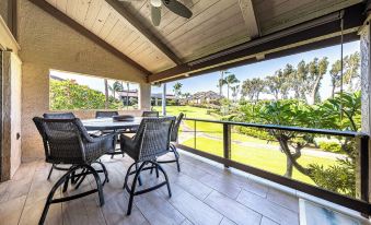 Start your day with coffee or unwind with afternoon cocktails on the oversized lanai, enjoying the lush tropical grounds, roaming wild turkeys, and ocean views. The lanai offers a perfect spot for watching golfers during the day and breathtaking sunsets in the evening. It features ample dining and outdoor seating, along with a wet bar and wine cooler.