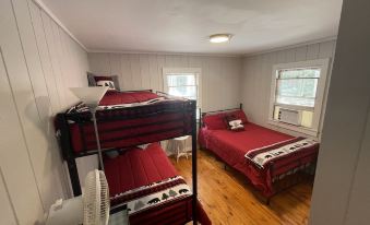 The first bedroom has a queen size bed with room to walk around the bed. The second bedroom has bunk beds (twin), and a full size bed. The lower level of home has a foosball table, an air hockey table and an area for games and cards. Please remember that this is a family atmosphere and we would like to rent to families for a great family vacation!!