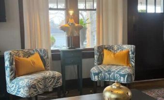 This restored historic home has a large covered front porch with a table with 2 chairs and 2 large rocking chairs. The living room has a couch (pull-out), 3 side chairs, and a large screen TV.