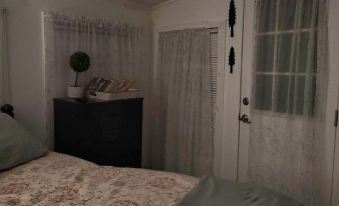 Second bedroom, guest favorite, has wall of windows for amazing view of creek and private entrance from porch.