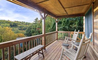 The cabin welcomes you with a warm, cozy main floor with exposed log walls and hardwood floors. The family room has vaulted ceilings, exposed beams, and comfortable furniture near the stone gas log fireplace. Warm up by the fire after a day on the slopes or exploring the High Country. The dining table for six and the kitchen are adjacent to the family room. The renovated kitchen has stainless steel appliances and granite countertops. Outside, the covered deck is the perfect place to enjoy morning coffee in the rocking chairs. Take in the mountain views and fresh mountain air while winding down after a day at Tweetsie Railroad or a round of golf. Gather around the fire pit to share stories or grill a favorite meal on the gas or charcoal grill.