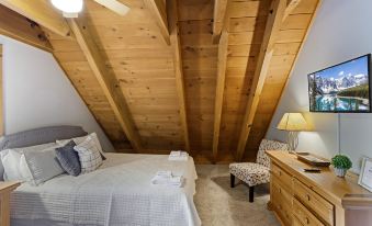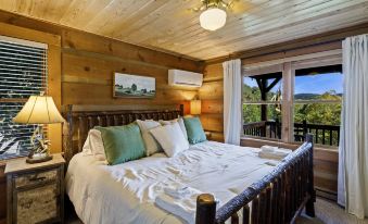 Ridgeview is a two-level, two-bedroom cabin accommodating up to six guests. The master bedroom is on the main floor and features a king bed, a Smart TV, and an ensuite bathroom. Upstairs, the second bedroom can sleep four in a queen and full bed. There is a full bathroom with a step-in shower on the second level. The loft has a comfortable sectional and a Nintendo gaming system for entertainment on a rainy afternoon.