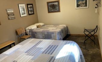 Bedroom has 1 queen bed and 1 full sized bed. Living room with TV, VCR, DVD player, electric fireplace. There is cell phone reception in the area. There is a Washer for your use. We DO NOT have a Dryer but offer a drying rack in the cabin and clothes line outside for drying purposes.