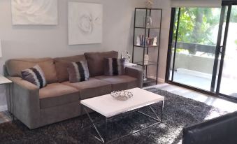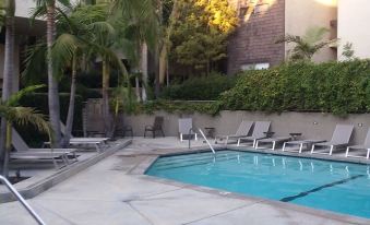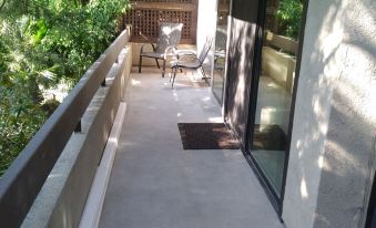 Unit is completely updated. New kitchen, baths, flooring, doors, central a/c, etc. Lots of closet and dresser space. Thirty five foot balcony overlooking trees and waterfall to relax or enjoy your morning coffee. Fantastic gated lush grounds with pool, spa, gym, sauna, library, laundry in building and gated indoor parking space. No pets or smoking. Very walkable safe area with stores, restaurants, bars and grocery store one block down. Fifteen minute walk to Sunset Strip and 15 minute drive to Hollywood Blvd. Minimum one month rental.