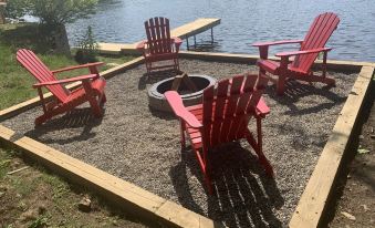 OUTDOOR entertainment areas in the property include a large BBQ patio overlooking the lake with a charcoal grill and a large table with chairs, a sunbathing deck next to the lake with a 5-person HOT TUB for whole-body massages, and a large FIRE PIT near the water. Firewood is available.