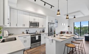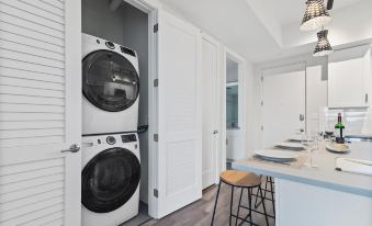 You will find that our kitchen is fully-equipped with appliances for longer-term stays, and features an 18-bottle wine refrigerator. Feeling at Home yet? Enjoy making some complimentary coffee/tea and turn coffee making into an enthusiast experience by using our pour-over coffee pot, creating more flavor to your rich cup of Joe. Island-style dining in the suite.