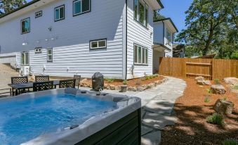 The backyard hosts a hot tub, outdoor seating, BBQ, and opens onto an oak grove, making this an ideal home for your gorge getaway!