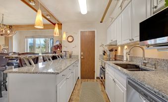 The bright and airy kitchen is fully equipped with all the appliances, utensils and cookware you need to feel at home. This thoughtfully-designed condo also has a private laundry area in the closet off of the kitchen. The dining area seats 6 guests at the bar-height table and bar stools.