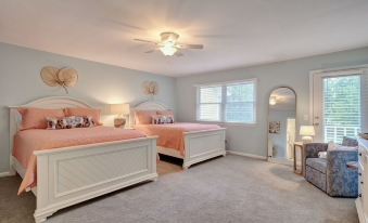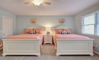 Walk upstairs to a spacious 20 x 20 bedroom with two queen size beds with luxury mattresses, new linens and beddings. Enjoy a 52" smart TV while relaxing in bed. The adjoining bathroom has two vanities, tub/shower and toiletry items . The bedroom closet is big enough for all your storage needs. A portable crib, high chair and booster seat can be found in the closet as well as games, cards, children's books and adult beach reads.