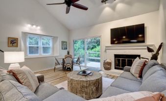 The cozy living space has a comfortable sectional couch, bar cabinet and a 65" smart TV. No wood fires are allowed in the townhome.