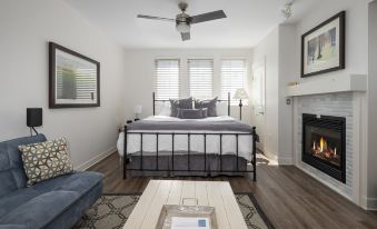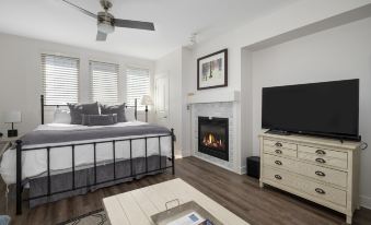 One can appreciate the gas fireplace and the large flat-screen television from the king-sized bed or the sitting area, which includes a cozy sofa. The full bathroom boasts a tiled shower surround, newly installed tile flooring and a modern vanity.