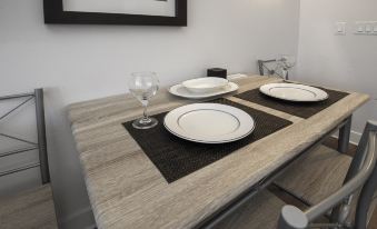 The kitchenette is equipped with granite countertops and stainless steel appliances featuring a mini-fridge, a two burner stove, a convection microwave oven, a dishwasher and a dining space.