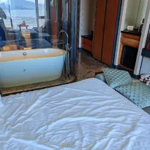 서비스 평점이 형편없는 것은 수영장 팔찌 담당자 때문이었습니다. 제가 질문을 하면 단 하나의 답변만 했고, 몇 가지 질문을 더 하면 참지 못하고 소리를 지르기 시작했습니다. 정말 용납할 수 없는 일이었습니다. 나중에 키가 121cm인 제 아이가 마지막 한 시간 동안 온천에 가도 되냐고 물었습니다. 제 말을 무시하고 티켓을 사라고 하지도 않았습니다. 수영장 팔찌만 주면 된다고 했습니다. 나머지는 제가 알아서 하라고 했습니다. 이 작은 오류 때문에 제 하루가 완전히 망가졌어요. 화가 나서 결국 로비 매니저에게 도움을 요청했습니다. 그가 정성껏 선물해 준 과일 접시도 정말 고마웠습니다.