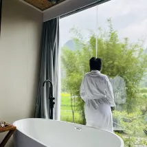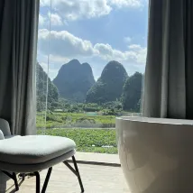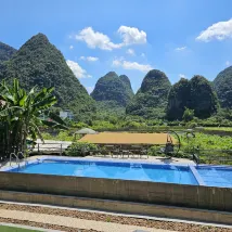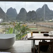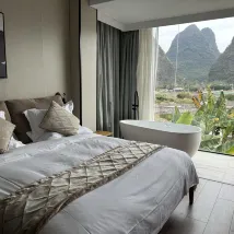숙소 답변: Thank you very much for choosing Gongxing Society · Yushe and attaching such a beautiful photo! Dear, I hope you can give us a five-star review next time. The slow life in the mountains, waters, and countryside is the best portrayal of Yangshuo. The hotel is conveniently located within the Yulong River Shili Gallery scenic area, within 8 kilometers of Yangshuo West Street, Big Banyan Tree, Moon Mountain, Gongnong Bridge, Hot Air Balloon, Parachute, Rock Climbing, Bamboo Raft Drifting and other scenic spots. It is easily accessible by electric bike. The rooms are all designed with full french window. When the curtains are opened, the landscape in front of us is Yangshuo. At the same time, the hotel is equipped with a lotus pond landscape infinity swimming pool, a stunning mirror of the sky, and a children's playground area, allowing you to relax and unwind. Thank you again for your positive feedback. We will do even better and look forward to meeting you again!