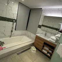 온라인에 나온 것만큼 좋지는 않아요. 객실 복도는 오래되었습니다. 부모-자녀방은 넓은데, 옷걸이가 매우 제한적입니다(30cm 미만). 변기 배수구 위치에 문제가 있어 물이 흐를 때 이상한 소리가 납니다.