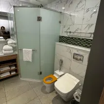샤워기 헤드는 친환경적이라고 하지만...실제로는 너무 느립니다. 결국 욕조에서 목욕을 해야 했는데, 샤워 커튼이 없어서 주변이 다 젖었어요.