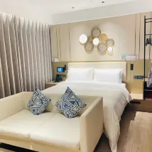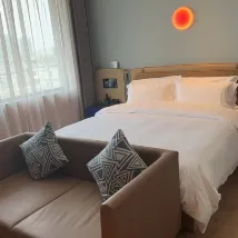 호텔 로비에 도착하자마자 미소를 지으며 인사하는 젊은 여성이 있었습니다. 그녀는 매우 따뜻했습니다. 체크인 후, 객실까지 짐을 옮기는 것을 경비원이 도와주었습니다. 청소부 아주머니도 웃으면서 인사해주셨어요. 방은 매우 넓고 편안했고, 작은 냉장고도 갖춰져 있었고, 커튼도 전자식이고, 화장실도 스마트 화장실이고, 방 안의 모든 시설은 인공호출로 조절 가능했어요. 간단히 말해서 이 호텔은 제가 이우에서 경험한 호텔 중 최고이며 가격 대비 성능 비율이 매우 높습니다 👍