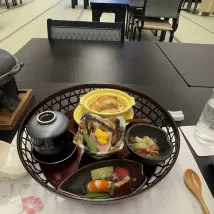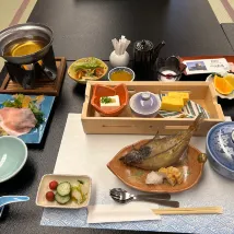 호텔 근처에는 여러분이 상상하는 것과는 달리 방문할 만한 온천 마을이 없습니다. 객실까지는 직접 짐을 운반해야 합니다. 아침과 저녁 식사는 사진과 같습니다. 호텔 셔틀버스가 없으므로 버스 정류장에서 도보로 약 5~7분이 소요됩니다.