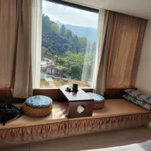 이곳은 돌로 된 보행자 전용 도로를 따라 걸어가야 하며 엘리베이터는 없지만 직원들이 짐을 옮기는 것을 도와주며 이를 해결하려고 노력합니다. HSR 역에서 무료로 픽업 서비스를 제공합니다. 객실에 들어서자 전망이 정말 환상적이었습니다. 이 호텔을 선택하게 되어 정말 기뻤습니다. 아침 식사는 맛있는 국수였고 창문 바로 옆에 앉아서 개울의 아름다운 전망을 감상했습니다.
