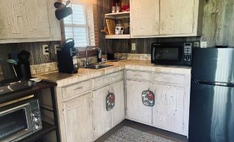 This private cabin sleeps four and is ideal for a small family or couple. As you step inside, you'll be greeted kitchenette, complete with a stove, oven, refrigerator, microwave, coffee maker, toaster, and all the dishes and utensils you'll need to prepare delicious meals. The adjacent living area with day bed hides another twin bed underneath with the convenience of a smart TV and free Wi-Fi. Step outside and relax on the porch, cook burgers or steak on the charcoal grill or explore the outdoor play area. The cabin features two bathrooms, providing ample space and privacy, as well as essential amenities like towels, basic soaps, a hair dryer, and an iron. Stay comfortable year-round with the cabin's air conditioning and heating, and enjoy the provided linens. For families the cabin is stocked with books and games. Embrace the great outdoors with the cabin's ample parking and outdoor furniture, perfect for enjoying the scenic surroundings. Dark sky is perfect for star-gazing and campfire pit when weather permits. Whether you're seeking a peaceful escape or a fun-filled adventure, our cabin is the ideal destination to create lasting memories.About pets:Pets allowed: dogs less than 20 lbs per pet (limit 2 pets total).About checkOut:Check out before 11:00 AM.About children:Children allowed: ages 3-17.Stairs make a danger for babies and toddlers..About customRules:Please leave guns in your vehicle..If we are expecting freezing weather we will have to give additional consideration to opening the cabin for rental. Reservation may be cancelled..About checkIn:Check in after 2:00 PM.About smoking:Smoking is not permitted.About minBookingAge:Minimum age to rent: 18.About events:No events allowed.
