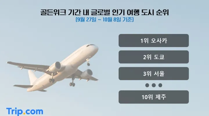 트립닷컴, 추석 황금연휴 예약데이터 기반 주요 여행 트렌드 발표 "추석 연휴 예약 데이터 발표, 떠나는 한국인, 찾아오는 외국인 모두 증가세" 아웃바운드, 인바운드 수요 모두 증가… 글로벌 인기 여행 도시 Top 10에 서울, 제주도 포함 [20250929] 다가오는 추석 황금연휴 [https://kr.trip.com/guide/info/2025%EB%85%84+%EC%97%B0%ED%9C%B4.html]를 앞두고 한국인들의 해외여행 [https://kr.trip.com/hot/tourist-guide/%ED%95%B4%EC%99%B8+%EC%97%AC%ED%96%89%EC%A7%80+%EC%88%9C%EC%9C%84.html] 수요가 급증하는 한편, 한국을 찾는 외국인 여행객도 크게 늘어나며 국내 여행시장이 양방향에서 활기를 띨 전망이다. 원스톱 글로벌 온라인 여행 플랫폼 트립닷컴(Trip.com)은 추석 연휴를 앞두고 자사 예약 데이터를 기반으로 한 주요 여행 트렌드를 29일 발표했다. 트립닷컴의 데이터에 따르면 최장 12일간 이어지는 이번 추석 황금연휴 동안 해외로 나서는 한국인 여행객은 전년 대비 약 80% 증가하며 활발한 해외여행 수요를 보였다. 특히 연휴기간 대비 항공 예약 [https://kr.trip.com/hot/promotions/%ED%95%AD%EA%B3%B5%EA%B6%8C+%ED%95%A0%EC%9D%B8%EC%BD%94%EB%93%9C.html] 의 62%가 일본과 동남아시아 주요국 등 단거리 노선에 집중되며, 단거리 여행 수요가 두드러졌다. 이러한 흐름은 한국이 더 이상 인근 국가 여행객만 찾는 단거리 관광지가 아닌, 글로벌 장거리 여행객까지 사로잡는 세계적 관광지로 도약하고 있음을 보여준다. 실제로 트립닷컴이 발표한 골든위크 기간 글로벌 인기 여행 도시 순위에서 서울 [https://kr.trip.com/hotels/seoul-hotels-list-274/]은 3위, 제주 [https://kr.trip.com/hotels/jeju-hotels-list-737/]는 10위에 올랐다. 서울은 오사카 [https://kr.trip.com/hotels/osaka-hotels-list-219/]·도쿄 [https://kr.trip.com/hotels/tokyo-hotels-list-228/]와 어깨를 나란히 하며 K-팝·드라마 등 K-컬처와 쇼핑, 미식, 나이트라이프를 아우르는 복합 관광지로 자리매김했고, 제주는 천혜의 자연환경과 힐링·레저 수요를 바탕으로 한 아시아 대표 휴양지로 부상했음을 확인했다. 홍종민 트립닷컴 지사장은 "추석 연휴 기간 한국인 여행객들의 해외여행 수요가 폭발적으로 늘어나는 동시에 한국을 찾는 외국인 관광객도 크게 증가하면서, 한국 여행시장이 양방향에서 활기를 띠고 있다"며 "서울과 제주의 글로벌 인기 도약은 한국이 아시아를 넘어 세계 여행자들에게 점차 매력적인 목적지로 각인되고 있음을 보여준다"고 말했다. 트립닷컴(Trip.com) 그룹 트립닷컴 그룹은 트립닷컴(Trip.com), 씨트립(Ctrip), 스카이스캐너(Skyscanner), 취날(Qunar)로 구성된 업계를 선도하는 글로벌 여행 서비스 제공 업체이다. 트립닷컴 그룹은 자사 플랫폼을 통해 전 세계 고객이 여행 상품과 서비스를 합리적인 가격에 제공받을 수 있도록 돕고, 파트너사의 다양한 여행 관련 콘텐츠 및 리소스를 모아 고객과 상품을 연결해 주고 있다. 트립닷컴은 모바일 앱과 웹사이트로 모두 이용할 수 있으며, 연중무휴 고객 서비스 센터도 운영하고 있다. 1999년 설립된 트립닷컴 그룹은 2003년 나스닥(NASDAQ), 2021년 홍콩 증권 거래소(HKEX)에 상장되었으며, "더 나은 세계를 위한 완벽한 여행을 추구한다"는 사명을 지니고 세계에서 가장 잘 알려진 여행 서비스 제공 업체가 되었다. 트립닷컴(Trip.com) 트립닷컴(Trip.com)은 글로벌 원스톱 서비스 온라인 여행사로 39개 국가 및 지역에서 24개 언어로 제공하고 있다. 아울러 220개 국가 및 지역의 3,400개 공항을 연결하는 640개 이상의 항공사와 150만 개 이상의 호텔, 20만 개 이상의 관광 명소 및 투어 상품으로 구성된 광범위한 네트워크를 보유하고 있다. 트립닷컴은 연중무휴 이용할 수 있는 세계적 수준의 다국어 고객 서비스를 통해 전 세계 수백만 고객에게 '최상의 여행을 제공'하기 위해 노력하고 있다.