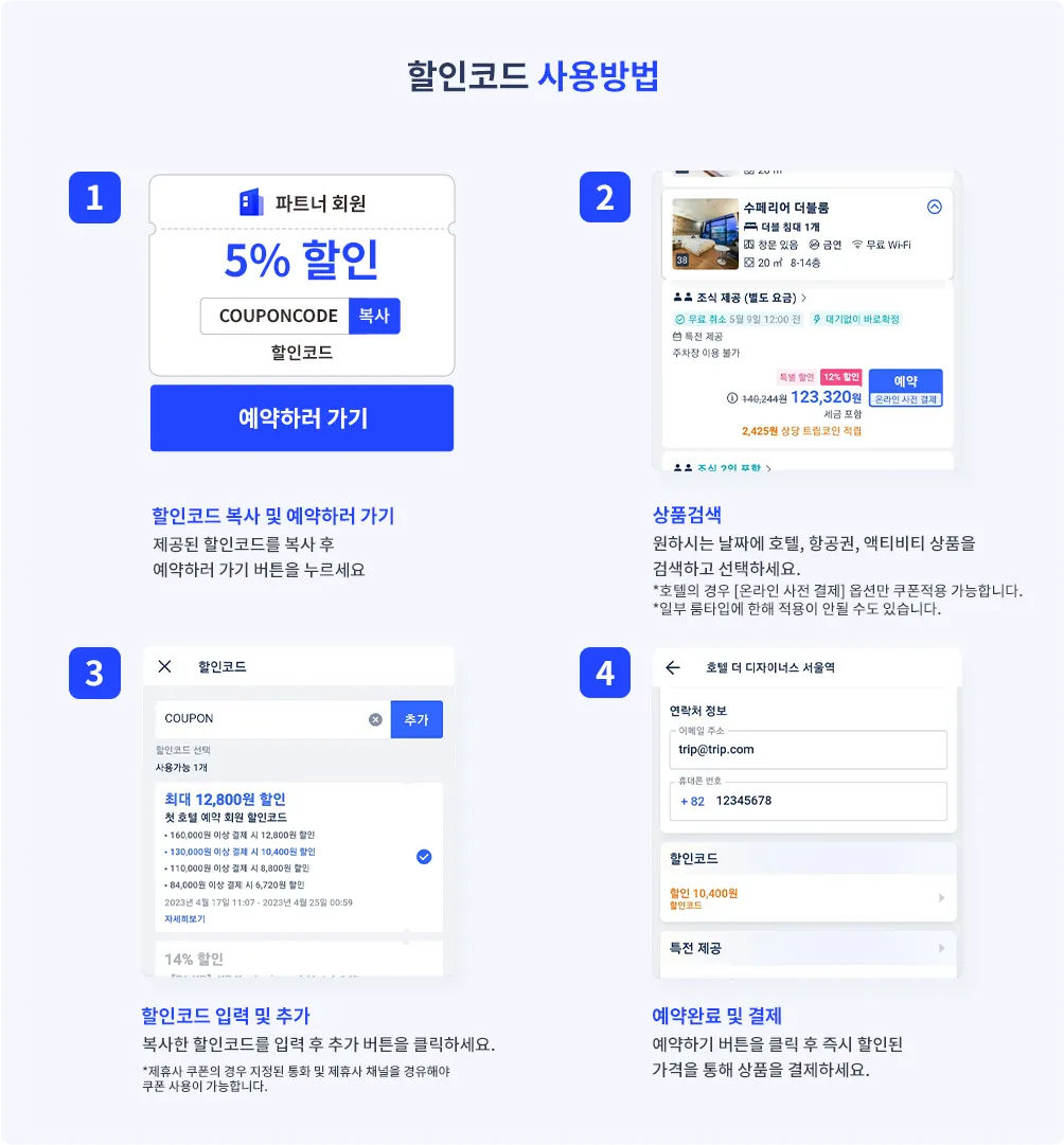 **트립닷컴이 지정한 특정 URL을 통해서 접속하고 즉시 결제한 건만 할인코드 사용이 가능합니다.