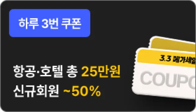 6. 항공, 호텔, 티켓 및 기차표 할인코드는 사용 선착순으로 제공되며, 공항픽업, 렌터카 50% 할인코드는 다운로드 선착순으로 준비된 수량이 소진 시 마감됩니다. 적용조건은 각 프로모션 코드에 따라 다를 수 있으며, 코드 약관에서 확인할 수 있습니다.