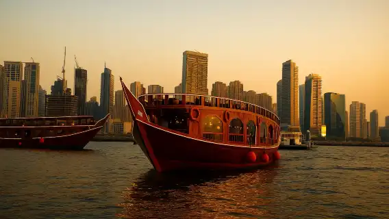 두바이 마리나 베이에서의 디너, 쇼, 호텔 픽업 옵션이 포함된 전통 선박(도우) 크루즈