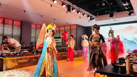 "당운아경·몰입형 향유" 대당 성대한 연회의 고풍스러운 공연장에 들어서면 마치 시간의 비밀 열쇠를 돌려 대당의 화려한 풍경 속으로 한 걸음 들어선 듯합니다. 정갈한 다과가 여기저기 놓여 있고, 어전 진미의 바삭한 과자부터 향기롭고 신선한 과일 접시까지 모두 고풍스러운 멋을 풍깁니다. 손님들은 편안히 앉아 귀에 들리는 신선한 음악, 비파와 거문고가 어우러져 내는 유려한 선율을 즐길 수 있습니다.