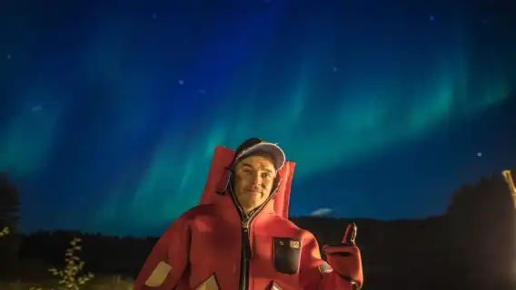 따뜻한 구조복을 입고 북극의 프라이빗 호수 위에서 안전하게 떠다니기 - 수영 실력 불필요. 인파에서 벗어나 라플란드의 숨막히는 풍경을 감상하세요.