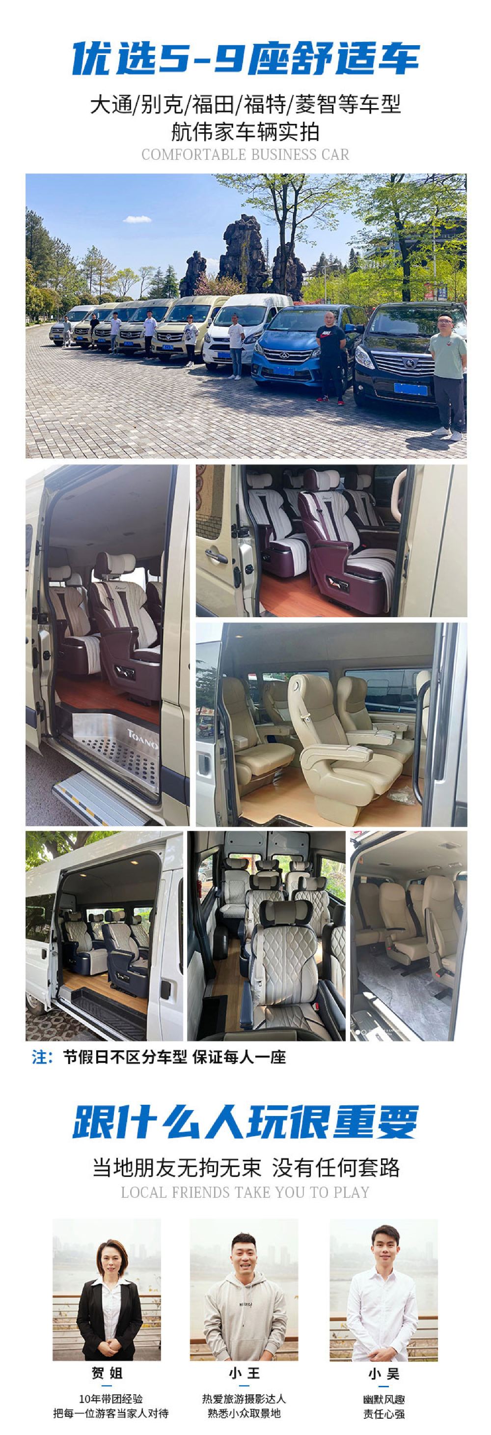 차량 종류 8인 소그룹은 규격에 맞는 7-9인승 비즈니스 차량을 사용합니다. 소형 차량은 사용하지 않습니다. (무릉까지 이동 시간이 길어, 고객님의 편안한 여행을 위해 차량 업그레이드를 최우선으로 고려하고 있습니다.)