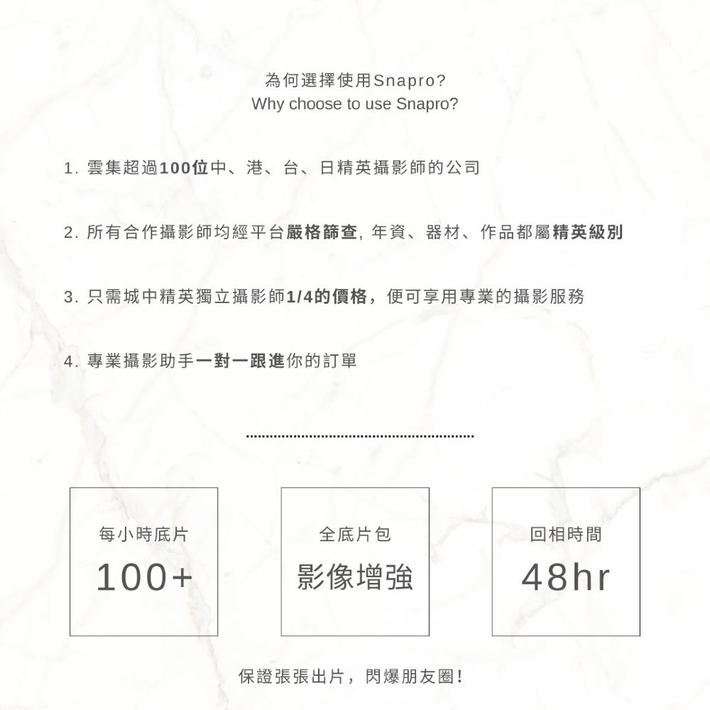 Snapro는 2시간, 4시간, 6시간 촬영을 포함한 가벼운 웨딩 사진 촬영 서비스를 제공합니다. 모든 사진작가는 Snapro 인증을 받았으며, 플랫폼의 철저한 모니터링을 통해 위험 부담을 최소화합니다. 플랜에는 예약 시간 동안 무제한 사진 촬영, 사진 보정 서비스, 고해상도 사진, 온라인 사진 앨범 다운로드가 포함됩니다.