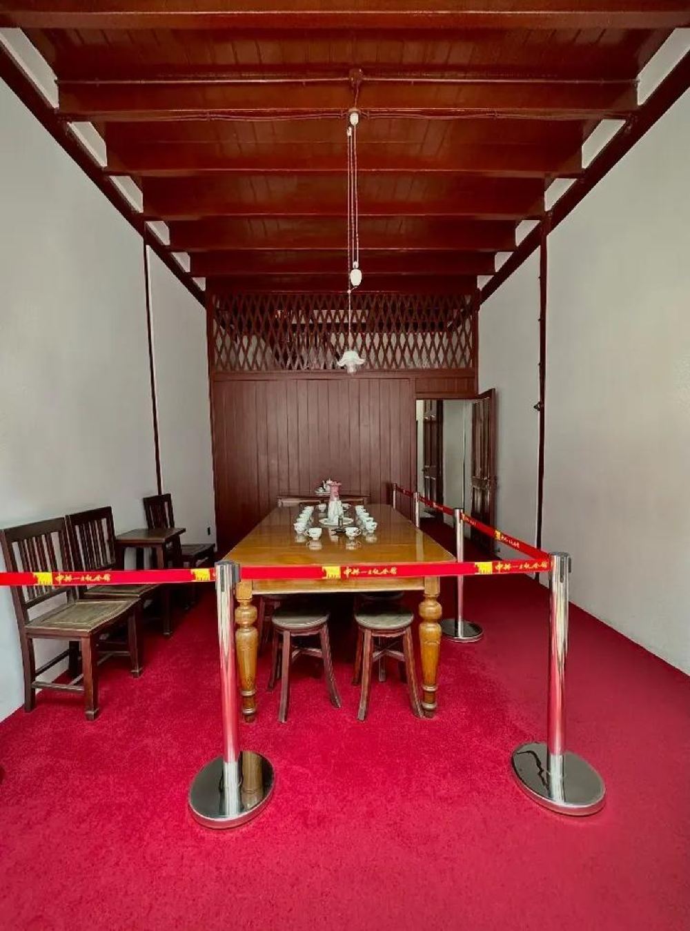 ▲ 18제곱미터도 채 되지 않는 거실에서 13명의 대표자들이 당 강령을 논의하며 창당을 완성했다. 당시 '삼계분치(三界分治)'라는 특수한 정치적 상황과 인구 유동성의 특징을 활용한 왕즈루(望志路) 106호(현 싱예루(兴业路) 76호)의 스쿠먼(石库门) 건물은 초기 혁명가들에게 위장과 연락 공간을 제공했다. 회의장은 극도로 간소하게 꾸며졌으며, 일반적인 책상과 의자만이 놓여 있었고 어떠한 정당의 상징물도 없어 창당 초기의 지하 투쟁 상태를 잘 보여주었다.