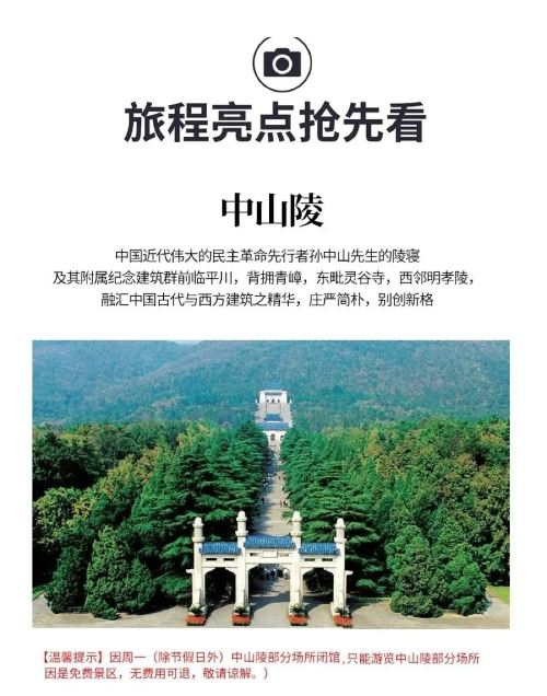 [예약 안내] 본 패키지 포함 사항: 중산 링위안 관광지(중산 능원관광지) 예약 서비스 + 가이드 30분 정도 해설, 예약 마감 시 전액 환불 가능, 종산 풍경구 내 관광지 교통수단 이용 가능(가이드 안내에 따름), 이용 시 10위안/인/1회(선택 사항) 참고 바랍니다!